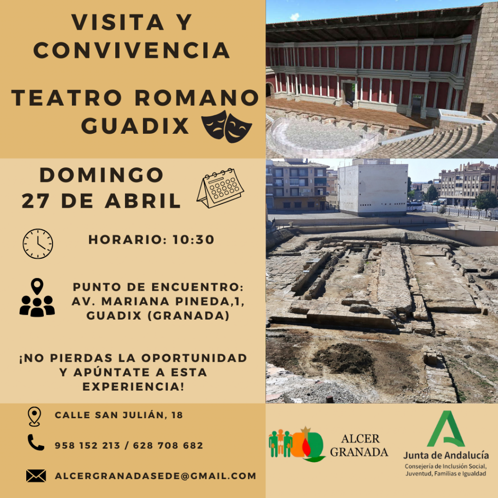 25 de abril de 2025Este domingo 27 de abril vamos a realizar una visita al Teatro Romano de Guadix. Dentro del programa de Ocio y Tiempo Libre para personas con Enfermedad Renal Crónica, de la Junta de Andalucía. Primero realizaremos la visita cultural al Teatro Romano de Guadix y, posteriormente, realizaremos una convivencia entre las personas asistentes a la actividad.