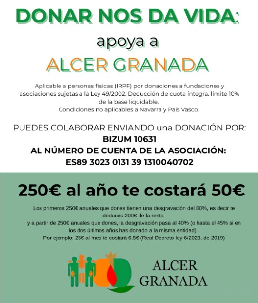 Como sabéis, ALCER Granada es una entidad sin ánimo de lucro y se encuentra acogida a la ley de Mecenazgo, por lo que puede recibir aportaciones económicas y, que a través de ella se puedan emitir certificados de donaciones. Estos certificados permiten declararlos como donación en la «Declaración de la Renta» o el IRPF, por lo que se deduce una gran parte de la aportación.