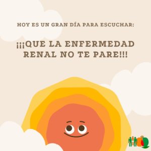 Por aquí os dejamos el enlace a un video, en el que aparecen varias personas con enfermedad renal crónica ofreciendo un pequeño mensaje para otras personas con la misma enfermedad. Tratan de transmitir que hay que seguir viviendo con la enfermedad y no para la enfermedad. El lema del video es «Que la enfermedad renal no te pare».
