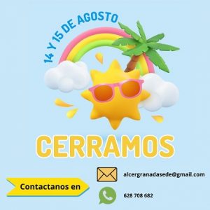 Este agosto decidimos no cerrar para seguir ofreciendo nuestros servicios, pero sí cerramos los días 14 y 15 de agosto (festivo nacional). Cualquier consulta, duda o aclaración, nos podéis escribir a través del correo electrónico: alcergranadasede@gmail.com o a nuestro whatsapp: 628 708 682 y os atenderemos lo más pronto posible.